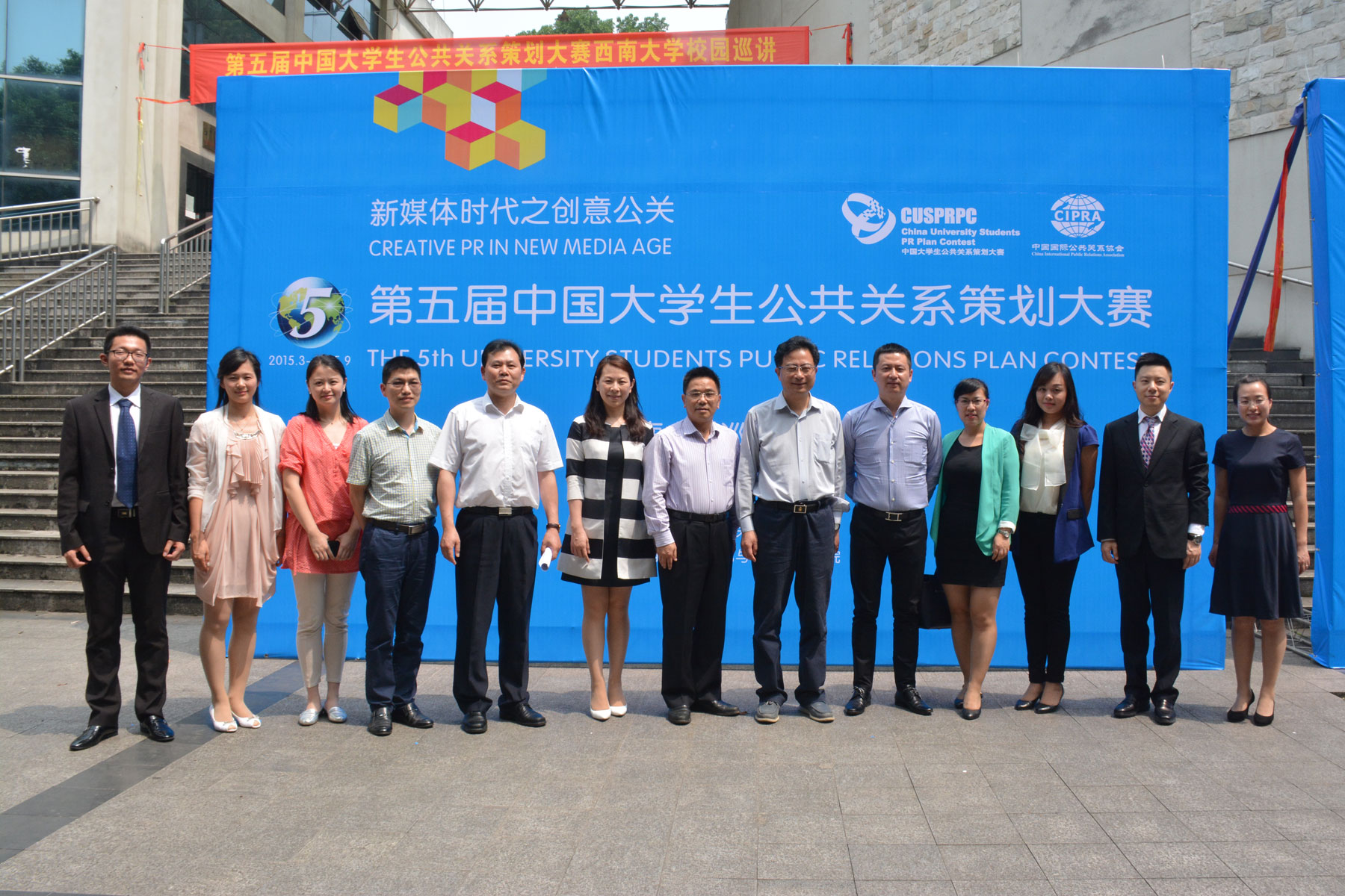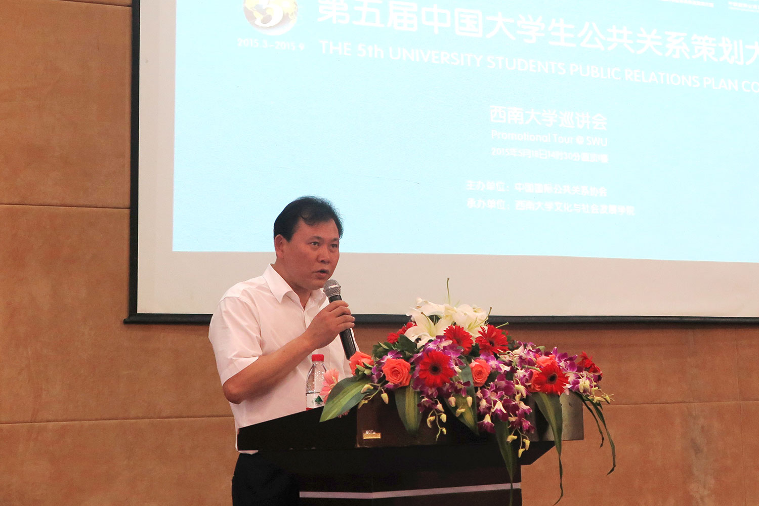 2015年5月18日下午14时30分,由中国国际公共关系协会主办的,西南大学文化与社会发展学院承办的第五届中国大学生公共关系策划大赛西南大学巡讲会在西南大学圆顶1楼报告厅成功举行。西南大学副校长陈时见与中国国际公共关系协会副会长、学术工作委员会主任委员、第五届中国大学生公共关系策划大赛技术指导、国际关系学院副校长郭惠民出席巡讲并致辞。参加此次巡讲的领导嘉宾还有,西南大学文化与社会发展学院院长陆林,中国国际公共关系协会副秘书长、第五届中国大学生公共关系策划大赛执行主任章兰。西南大学文化与社会发展学院院长陆林主持此次会议。