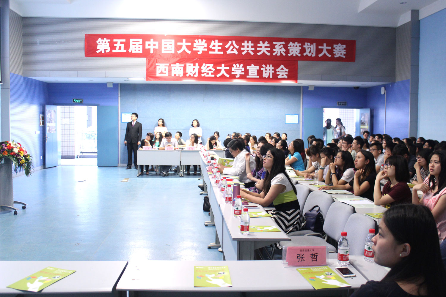 2015年5月26日下午18时30分,第五届中国大学生公共关系策划大赛西南财经大学站巡讲在西南财经大学柳林校区学生活动中心视频会议厅成功举行。西南财经大学副校长张邦富教授,中国国际公共关系协会副秘书长、第五届中国大学生公共关系策划大赛执行主任章兰出席此次巡讲并致辞。参加此次巡讲的领导还有西南财经大学公共管理学院院长唐兴霖教授,分党委书记章群教授,学生职业规划与就业指导中心主任杜琳,档案馆副馆长金元平,学生工作部副部长胡舒,公共管理学院分党委副书记郑良秀,西南交通大学公共管理学院学生工作组组长余小英。